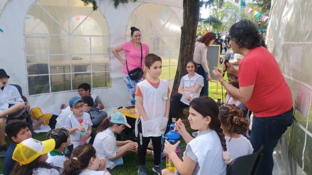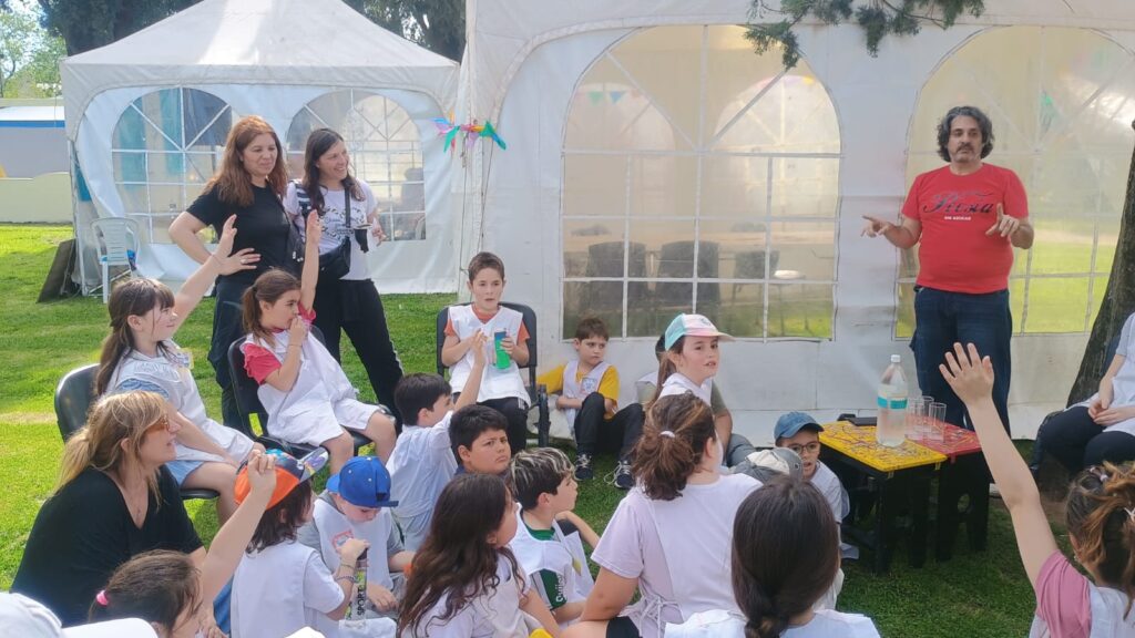 La actividad estaba prevista para adultos, pero «pasaron cosas»… Algunas demoras, algo de calor y otras vicisitudes fueron proponiendo un nuevo escenario. La feria del libro, vale decir: la plaza, a las 15 estaba poblada de un público menudo. A la sombra se multiplicaban los grupos de pequeños con guardapolvos blancos que habían ido a vivenciar la propuesta cultural que les permite -año a año- no sólo estar cerca de los libros, sino también conocer a algunos autores.